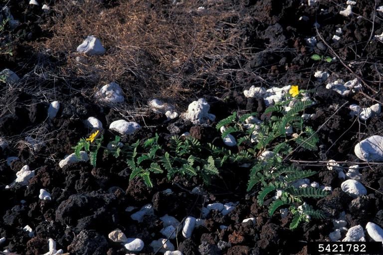 The Jamaican Feverplant or Puncture plant (Tribulus cistoides) invades dunes, coastal areas, sandy and disturbed sites forming thick mats. The plant produces sharply spined fruits that can cause injury when stepped on, hence the name Puncture vine. © Forest and Kim Starr, Starr Environmental, Bugwood.org
